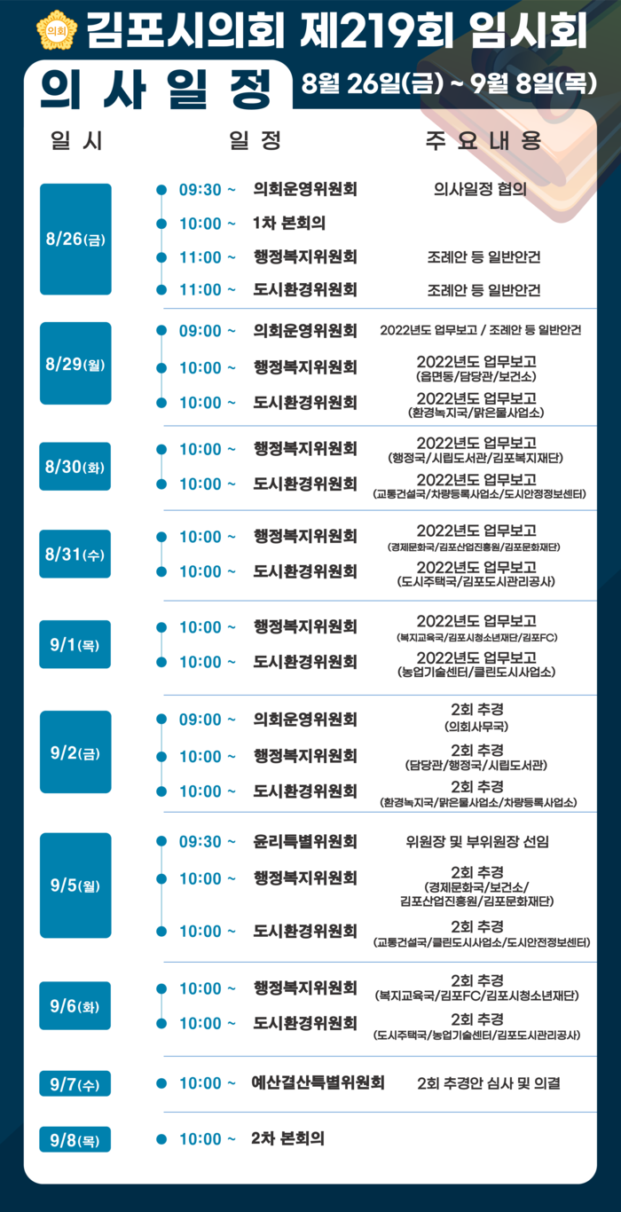 9월2일에는 행정사무감사계획서를 작성한 후, 6일까지 소관별 제2회 추경안 심사를 진행하고 7일 예산결산특별위원회를 열어 추경안과 기금변경안을 심사·의결한다.