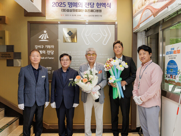 서울 강서구가 최근 꾸준한 기부로 나눔문화 확산에 앞장선 기부자의 소중한 뜻을 기리기 위해 ‘명예의 전당 헌액식’을 개최했다. 이번 헌액식에선 어려운 이웃을 위해 총 3억3000여만원을 기탁한 (주)알제이아이가 우수기부자로 선정됐다. 사진은 진교훈 구청장(왼쪽 두 번째)이 우수기부자와 기념 촬영을 하는 모습. (사진=강서구청 제공)
