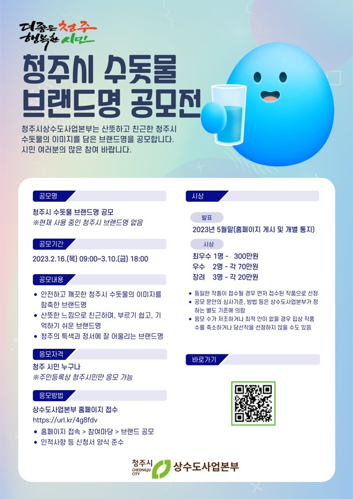 한편 이번 공모로 브랜드명이 결정되면 브랜드에 어울리는 BI를 제작해 청주시 수돗물의 홍보에 사용할 예정이다.