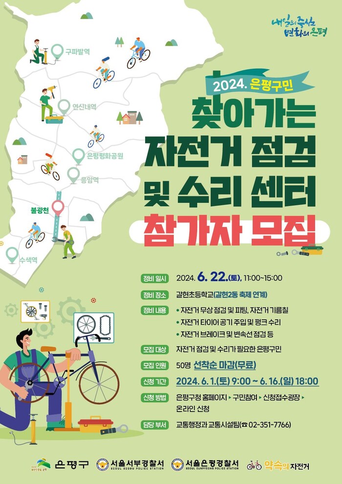 [시민일보 = 이대우 기자] 서울 은평구(구청장 김미경)는 구민 누구나 자전거를 안전하게 탈 수 있도록 ‘2024. 은평구민 찾아가는 자전거 점검 및 수리센터’를 운영한다고 밝혔다.