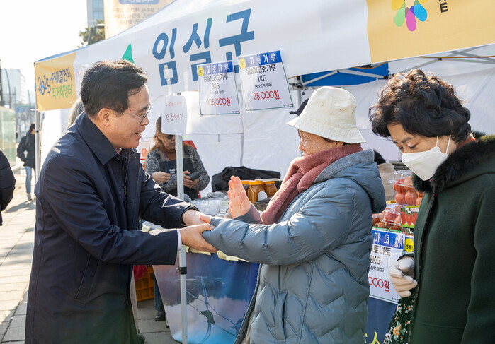 | ▲ 진교훈 구청장(왼쪽)이 지난 1월17일 마곡광장에서 열린 ‘설맞이 직거래장터’를 방문해 장터를 찾은 주민과 인사를 나누고 있다. (사진=강서구청 제공) |