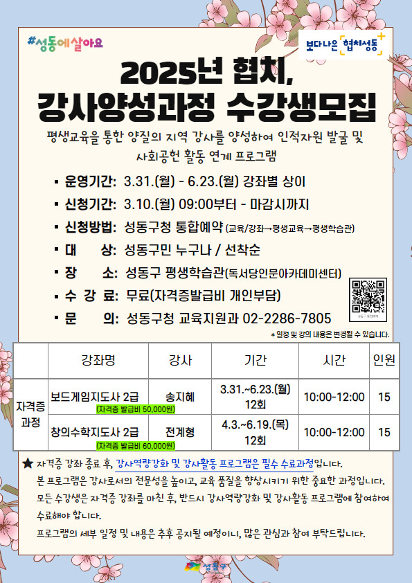 성동구 평생학습관에서 진행되는 '협치, 성동구민 강사양성과정'은 '보드게임지도사 2급'과 '창의수학지도사 2급' 자격증 과정을 운영한다. 각 과정은 총 12회차로 구성되며, 자격취득자는 이후 강사 역량강화 교육을 통해 실전 강사로서의 능력을 배양하게 된다.