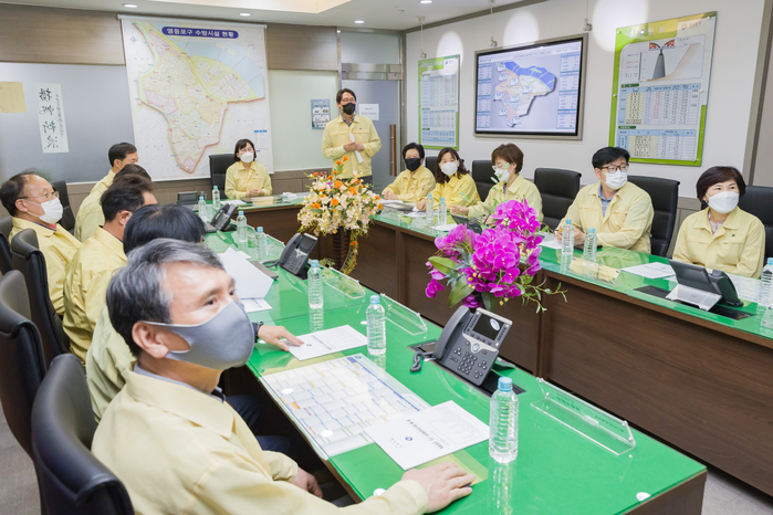 | ▲ 지난 5월13일 영등포구청 재난안전대책본부 상황실에서 관계 부서장들이 ‘2022년 풍수해 재난안전대책 추진계획’에 대해 논의하고 있다. (사진제공=영등포구청) |