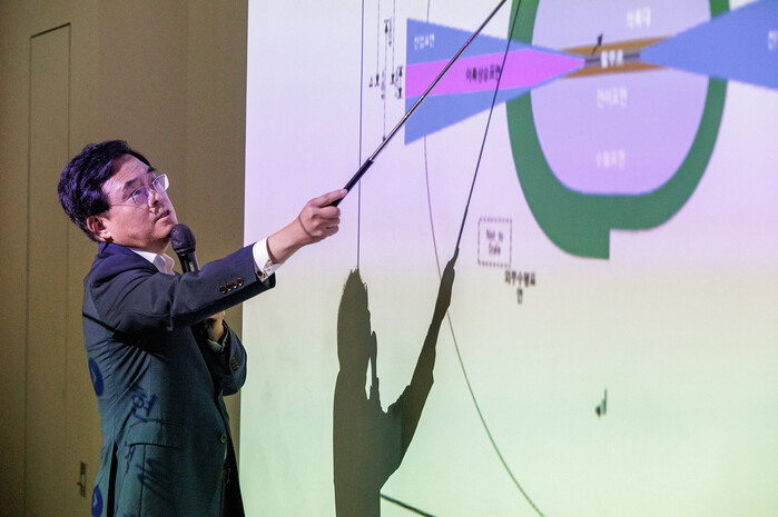| ▲ 진교훈 구청장이 마곡안전체험관에서 열린 ‘기자 설명회’에서 국제민간항공기구 (ICAO) 기준 개정에 따른 변화와 김포공항에 대한 적용방안에 대해 설명하고 있다. (사진=강서구청 제공) |