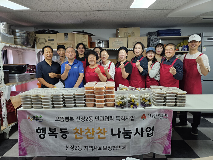 경기 오산시 신장2동 행정복지센터가 최근 신장2동 지역사회보장협의체와 함께 ‘행복동 찬찬찬 나눔 사업’을 특별 운영했다. 사진은 협의체 위원들이 나눔에 참여하고 기념 촬영을 하는 모습. (사진=오산시청 제공)