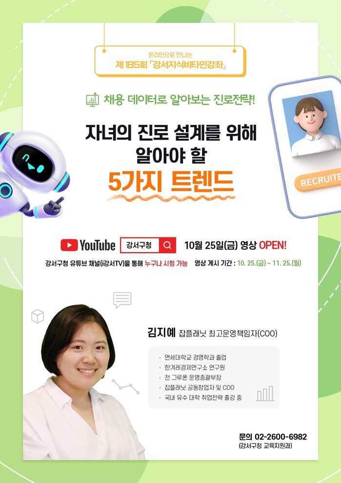 [시민일보 = 박소진 기자] 서울 강서구(구청장 진교훈)는 ‘자녀의 진로 설계를 위해 알아야 할 5가지 트렌드’라는 주제로 제185회 강서지식비타민강좌를 진행한다고 24일 밝혔다.