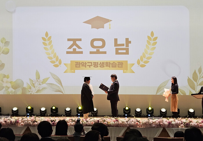 | ▲ 지난 12일 개최된 초등·중학 학력 인정 문해교육 졸업식‘에서 관악구 대표로 학력 인정서를 받은 조오남씨. (사진=관악구청 제공) |