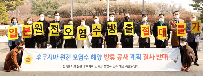| ▲ 일본 후쿠시마 방사성 오염수 방류 대응 특별위원회가 일본 원전 오염수 방출 절대 불가라는 팻말을 들고 오염수 해양 방류 공사계획 반대를 촉구하고 있다. (사진제공=경기도의회) |