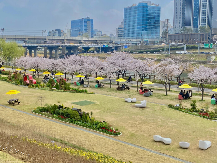 중랑천 일대는 봄이면 벚꽃과 형형색색의 튤립이 만개해 주민들의 발길이 끊이지 않는다. 구는 봄꽃의 아름다움을 더욱 가까이에서 즐기며, 편안한 쉼을 누릴 수 있도록 성동교 인근 하천변에 ‘일상 속 여행’을 주제로 ‘피크닉 정원’을 조성했다.