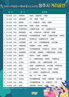 이후에도 농업기술센터, 용담광장, 동부창고, 문의문화재단지, 문암생태공원, 초정문화공원, 성안길, 소나무길 등 청주 시내 곳곳에서 시민들의 예술적 감수성을 충족시켜줄 공연을 총 22회 선보일 예정이다.