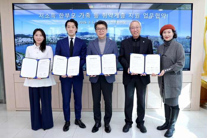 [시민일보 = 박소진 기자] 성동구(구청장 정원오)는 지난 5일 ㈜캄미어패럴 및 밀알복지재단과 함께 저소득 한부모가족 지원을 위한 업무협약을 체결했다고 밝혔다.