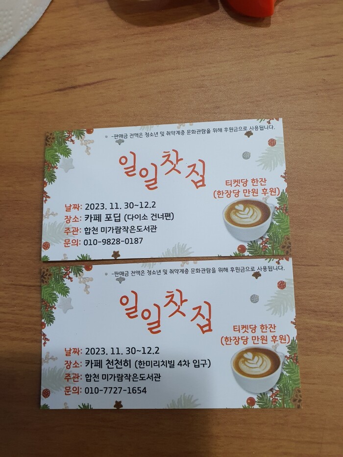 [합천=이영수 기자] '합천 미가람작은도서관'(회장 윤미경)에서는 11월 30일부터 12월 2일까지 3일간 합천읍 일원 카페 포딥 과 카페 천천히에서 청소년 및 취약계층 문화관람을 위한 후원금 마련을 위해 일일찻집을 운영한다고 밝혔다.