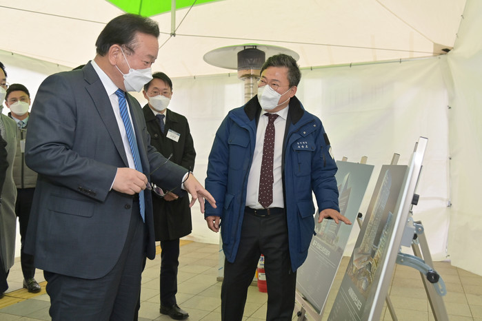 | ▲ 서 구청장(오른쪽)이 김 총리(왼쪽)에게 'SMP·행정복합청사' 사업 설명을 하고 있다.(사진제공=중구청) |