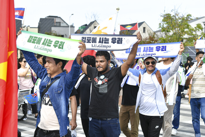 | ▲ 지난 9월24일 김포에서 열린 세계인 큰잔치에서 김포거주 이주민들이 ‘김포에 사는 우리’ 슬로건을 들고 행진하고 있다. (사진=김포시청 제공) |