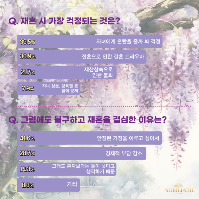 이번 설문조사는 노블리에의 재혼 회원 500명을 대상으로 진행됐으며 조사 결과 재혼에 관한 가장 큰 고민으로는 자녀에게 혼란을 줄까 봐 걱정이 전체의 39.5%로 가장 큰 비중을 차지했다. 이어 전혼으로 인한 결혼 트라우마가 30.9%로 뒤를 이었고 재산상속으로 인한 불화가 21.7%, 자녀 성본 및 양육권 등 법적 문제가 7.9%로 집계되었다.