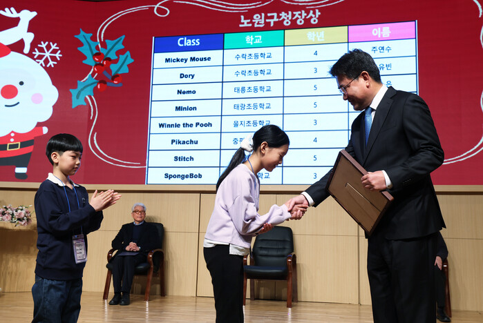 | ▲ 오승록 노원구청장이 5일 오후 서울 노원구 삼육대학교 요한관 대강당에서 열린 ‘겨울방학 노원 어린이 원어민 영어캠프’ 1차 퇴소식에 참석해 우수 학생에게 상장을 전달하고 있다. (사진=노원구청 제공) |
