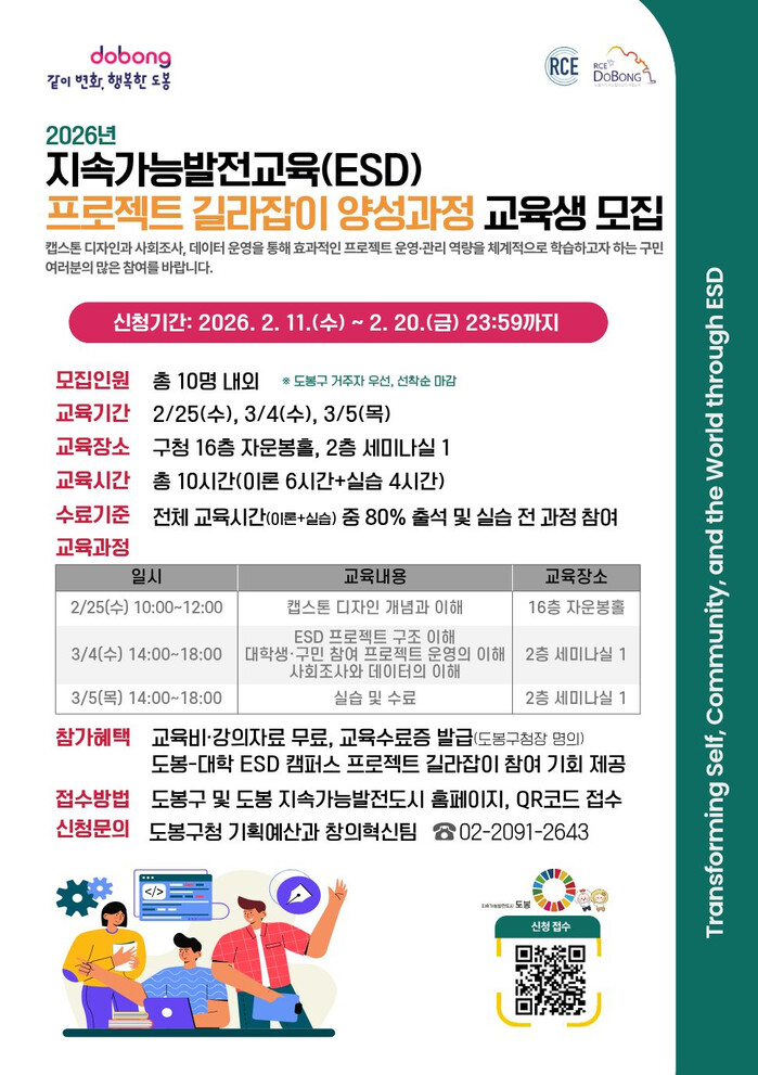 교육은 2월 25일과 3월 4일, 3월 5일에 걸쳐 총 10시간(이론 6시간, 실습 4시간) 과정으로, 도봉구청에서 진행된다. 출석률 80% 이상 및 실습 전 과정 참여 시 교육수료증이 발급되며, ‘도봉-대학 ESD 캠퍼스 프로젝트 길라잡이’ 참여 기회도 제공된다.
