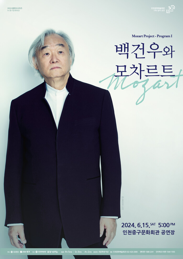 인천중구문화재단과 협업해 선보이는 2024 클래식 시리즈Ⅲ <백건우와 모차르트>는 15일 오후 5시, 중구문화회관에서 열린다. R석 5만원, S석 3만원, A석 2만원이며 초등학생 이상 관람 가능하다. 자세한 문의는 인천문화예술회관으로 하면 된다.
