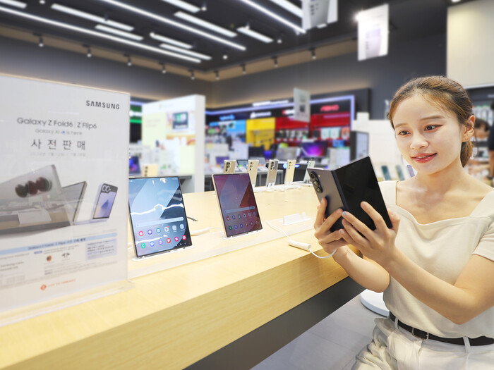 | ▲ 롯데하이마트가 12일부터 18일까지 ‘갤럭시Z 폴드·플립6’ 사전 예약을 진행한다. 모델이 롯데하이마트 매장에서 ‘갤럭시Z 폴드·플립6’을 보고 있는 모습이다. (사진=롯데하이마트 제공) |