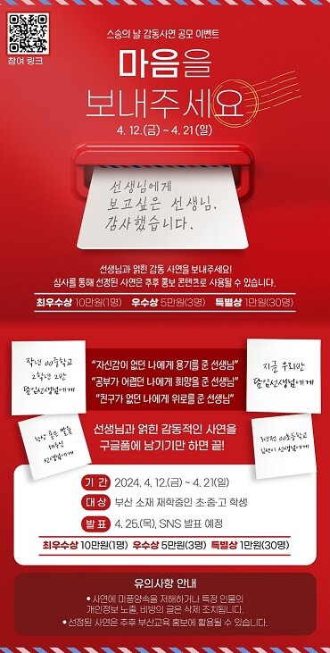 이번 이벤트는 부산지역 초·중·고등학생을 대상으로 선생님과 얽힌 감동적인 사연을 모집하는 방식으로 진행한다. 참여 희망 학생은 이달 21일까지 구글폼 또는 안내 포스터의 QR코드를 통해 사연을 제출하면 된다.