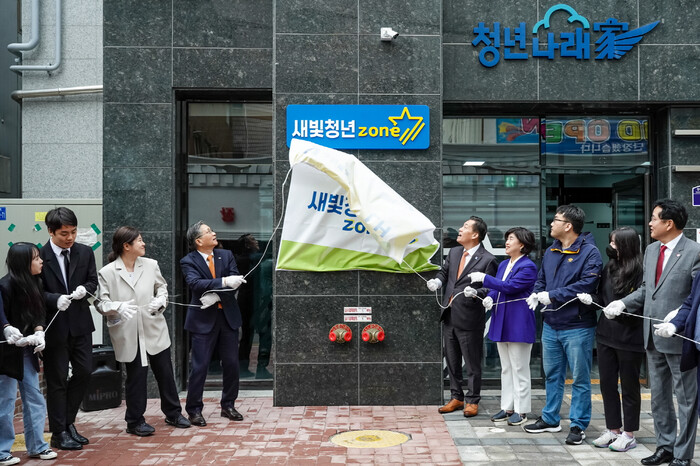 | ▲ 역세권 공공임대주택 새빛청년존 1호 입주기념식에서 현판 제막을 하고 있다. (사진=수원시청 제공) |