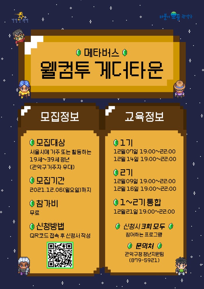 [시민일보 = 여영준 기자] 관악구(구청장 박준희)는 2030 청년들을 위해 오는 12월7일부터 메타버스 플랫폼을 활용한 '메타버스 웰컴투 게더타운' 교육 프로그램을 운영한다고 밝혔다.