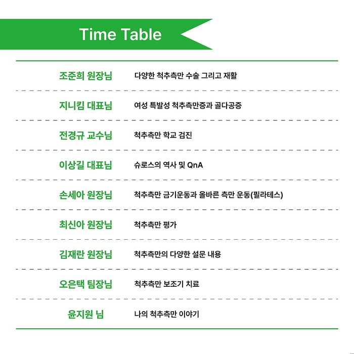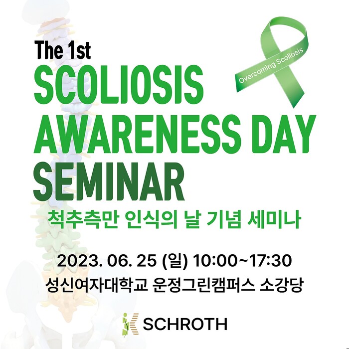 오는 25일(일) 성신여자대학교 운정그린캠퍼스 소강당에서 척추측만에 대한 궁금증을 중심으로 3차원 보조기, 운동프로그램, 접근 방법, 척추측만증 가족의 이야기 등 토크콘서트 형식으로 세미나가 진행될 예정이다.