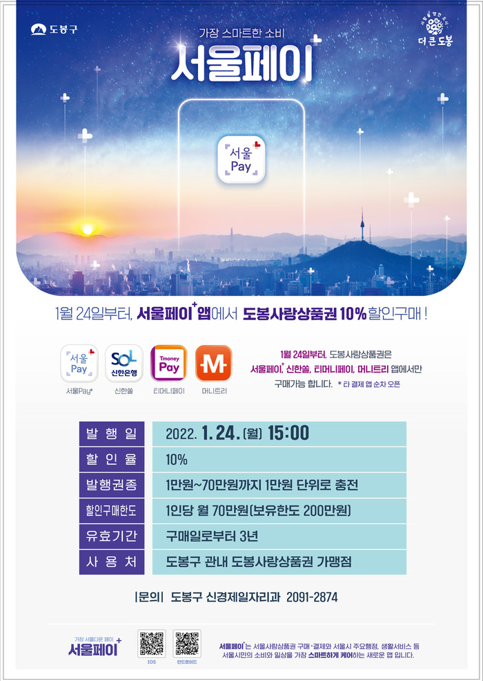 한편 기존 구매해 보유 중인 도봉사랑상품권은 2월 말까지는 기존 앱(비플제로페이, 체크페이 등)에서 사용할 수 있으나, 3월1일부터는 '서울Pay+'앱으로 자동 이관되니, 기존 보유 상품권을 사용하려면 '서울Pay+' 앱을 설치해야 한다.