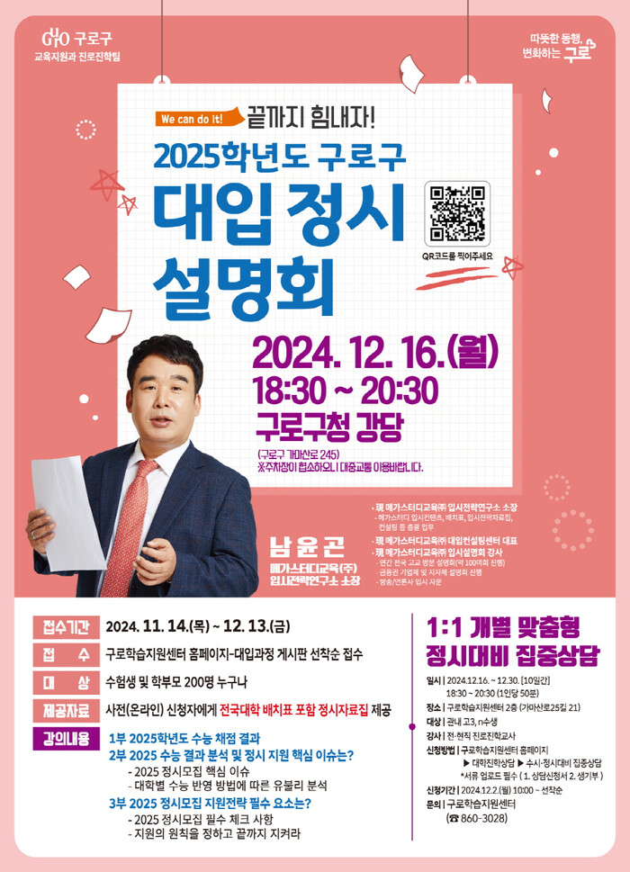 [시민일보 = 박소진 기자] 구로구가 정시 준비에 어려움을 겪고 있는 수험생과 학부모의 지원사격을 위한 2025학년도 대입 정시설명회를 개최한다고 15일 밝혔다.
