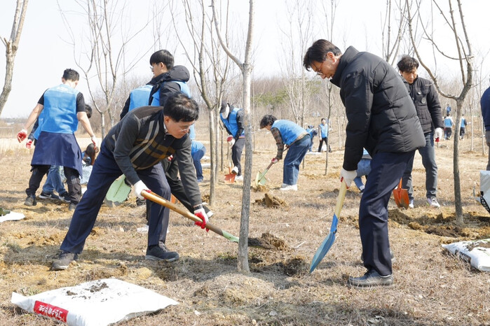 행사에는 진 구청장을 비롯해 환경단체 회원, 가족 등 150여명이 참여했다. 참가자들은 비료를 주며 나무의 생장 상태를 살폈다.