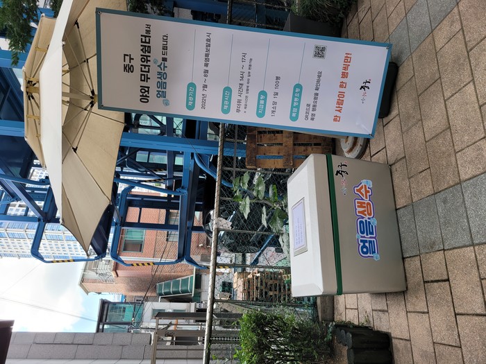 | ▲ 야외 무더위쉼터에 얼음생수가 놓여 있다.(사진제공=중구청) |