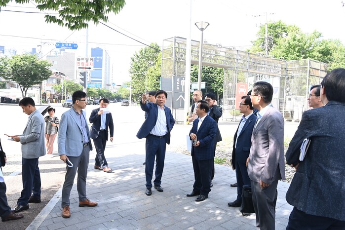 | ▲ 조용익 시장이 복잡한 진입 방법으로 인해 혼선을 빚고 있는 부천아트벙커B39 진입로를 찾아 문제점을 직접 살피고 있다. (사진=부천시청 제공) |