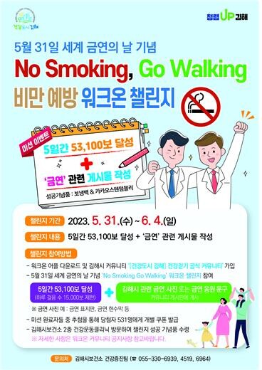 챌린지 참여를 원하는 시민은 휴대폰에서 ‘워크온’ 앱 다운로드 > 김해시 커뮤니티 ‘[건강도시 김해] 건강걷기 공식 커뮤니티’ 가입 > 챌린지 예약 또는 참여하기 버튼 클릭> 챌린지 기간 동안 총 5만3100보 걷기 & 금연 관련 게시물 올리기 > 챌린지 달성 쿠폰 응모하기 순으로 진행하면 된다.