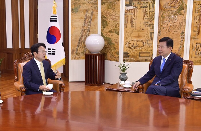 | ▲ 강기정 광주광역시장(왼 쪽)이 22일 오전 서울 여의도 국회본관에서 김진표 국회의장과 만나 지역현안과 광주군공항이전 특별법 국방위법안심사 소위통과 등을 건의하고 있다./광주광역시 제공 |
