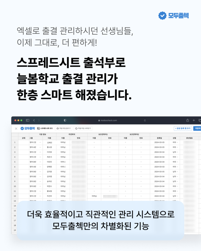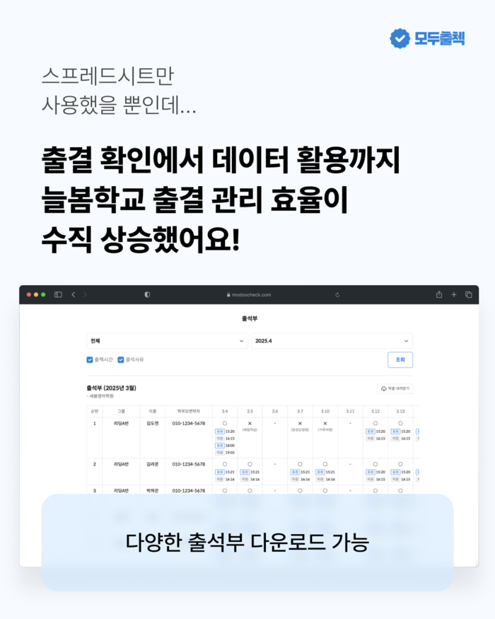 모두출첵은 학생의 등하교 및 수업 출결을 실시간으로 기록하고, 카카오 알림톡이나 문자로 학부모에게 즉시 알림을 전송하는 기능을 갖추고 있다. 또한, 교육청 제출용 출석부와 수강생 명단도 손쉽게 엑셀 파일로 출력할 수 있어, 교사와 담당자의 행정 업무 부담을 크게 경감시킨다.
