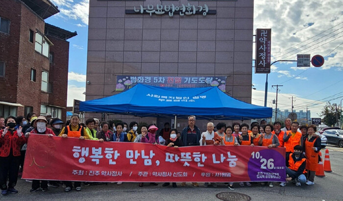 진주시 상봉동 행정복지센터는 26일 상봉동 소재 약사정사(주지 진여스님)에서 약사정사 신도회 주관으로 지역 어르신들을 위한 무료 도시락 나눔 행사를 개최했다고 밝혔다.