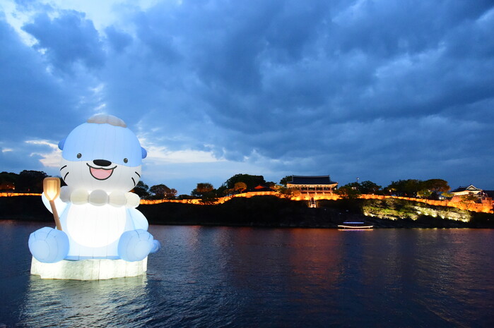 | ▲ 강 위에 떠있는 진주 마스코트 ‘하모’. (사진=진주시청 제공) |