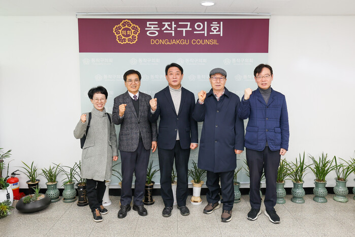| ▲ (왼쪽부터) 상도4동 최명자 회장, 신대방1동 장명식 회장, 동작구의회 정재천 의장, 사당4동 유재철 회장, 사당3동 김병용 회장. (사진=동작구의회 제공) |