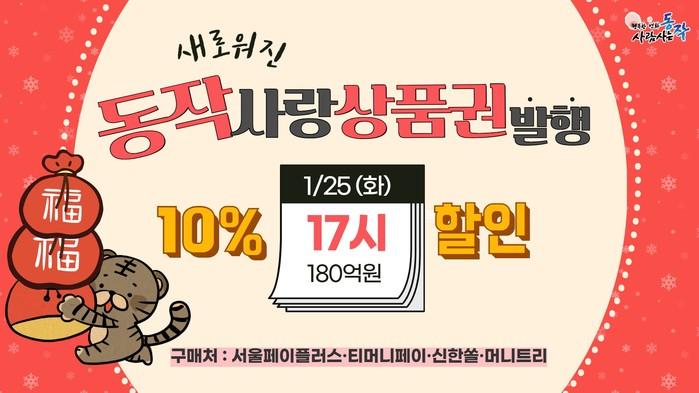 [시민일보 = 여영준 기자] 동작구(구청장 이창우)는 설 명절을 앞두고 지역경제 활성화와 소비활동 촉진을 위해 오는 25일 오후 5시부터 총 180억원 규모의 동작사랑상품권을 발행한다고 밝혔다.