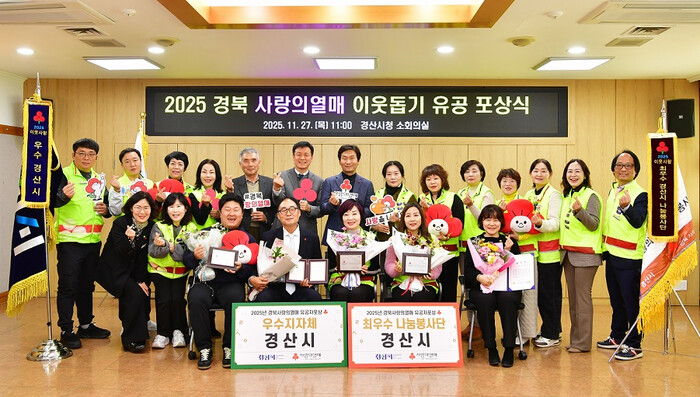 [안동=박병상 기자] 경북사회복지공동모금회(회장 전우헌, 이하 경북모금회)는 11월 27일 오전 경산시청에서 ‘2025 경산시 이웃돕기 유공자 포상식’을 개최하고, 지역 나눔문화 확산에 기여한 개인과 단체에 표창을 수여했다고 밝혔다.