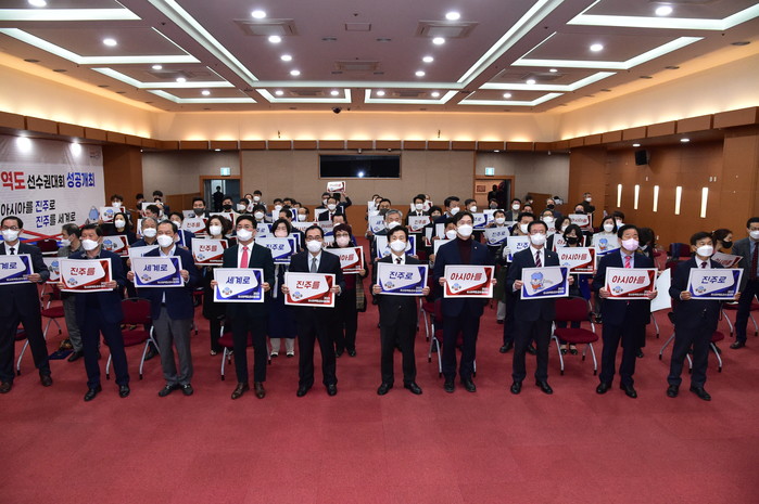 | ▲ ‘아시아 역도선수권대회 출범식’ 참석자들이 ‘진주를 세계로’라는 피켓을 들고 있다. (사진제공=진주시청) |