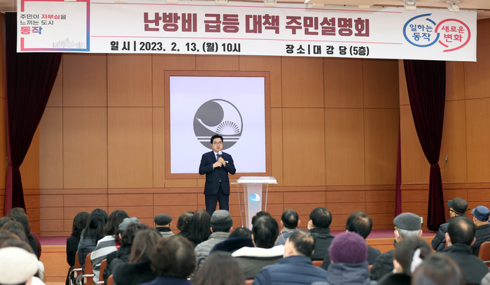 | ▲ 지난 13일 난방비 급등 대책 주민설명회에 참석한 박일하 구청장이 인사말을 하고 있다.(사진=동작구청 제공) |