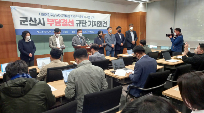 지난 6일 전북도의회에서 더불어민주당 지방선거 경선에 참여했던 예비후보들이 공정한 경선이 이뤄지지 않았다며 당을 규탄하는 기자회견을 하고 있다.