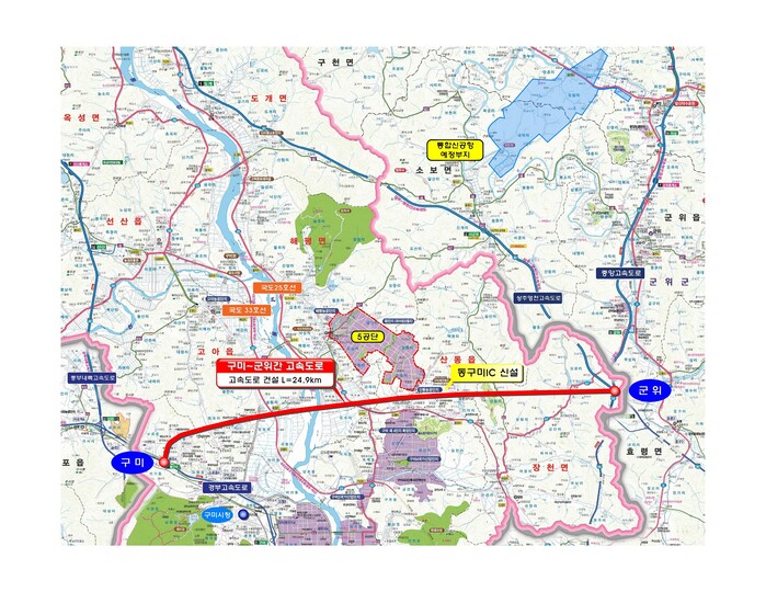 「제2차 고속도로 건설계획」에 반영된 구미~군위 고속도로 건설은 총연장 24.9km에 1조 5,468억 원이 투입되는 대규모 사업으로, 지난 10월 국토교통부에서 사전타당성 조사 용역을 착수했다.