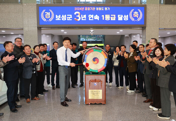 | ▲ 보성군이 ‘2024년 공공기관 종합청렴도’ 평가에서 3년 연속 1등급을 달성해 김철우 군수(가운데)가 청렴신문고를 두들기며 군 관계자들과 축하를 나누고 있다. (사진=보성군청 제공) |