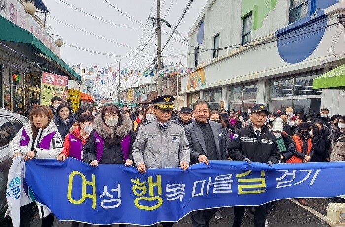 | ▲ 김경일 시장이 시에서 열린 '여성행복 마을길 걷기대회'에 참여해 참여자들과 함께 플래카드를 들고 길을 걷고 있다. (사진=파주시청 제공) |