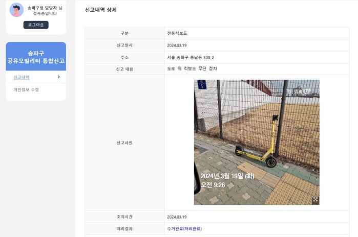 [시민일보 = 이대우 기자] 서울 송파구(구청장 서강석)가 전국 최초로 구축한 ‘공유모빌리티 통합신고시스템’이 거리의 방치된 전동킥보드 등을 신속하게 처리하는 데 효과가 있는 것으로 나타났다.