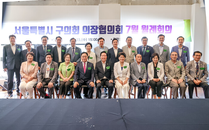 | ▲ 서울시 구의회 의장협의회 월례회의에 참석한 자치구 의장들이 회의 후 기념촬영을 하고 있다. (사진=서울시 구의회 의장협의회 제공) |
