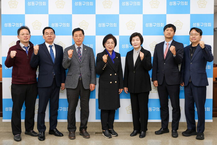 | ▲ ‘2024 회계연도 결산검사 위원 위촉장 수여식’에서 남연희 의장(가운데)이 결산검사 선임 의원들과 기념 촬영을 하고 있다. (사진=성동구의회 제공) |