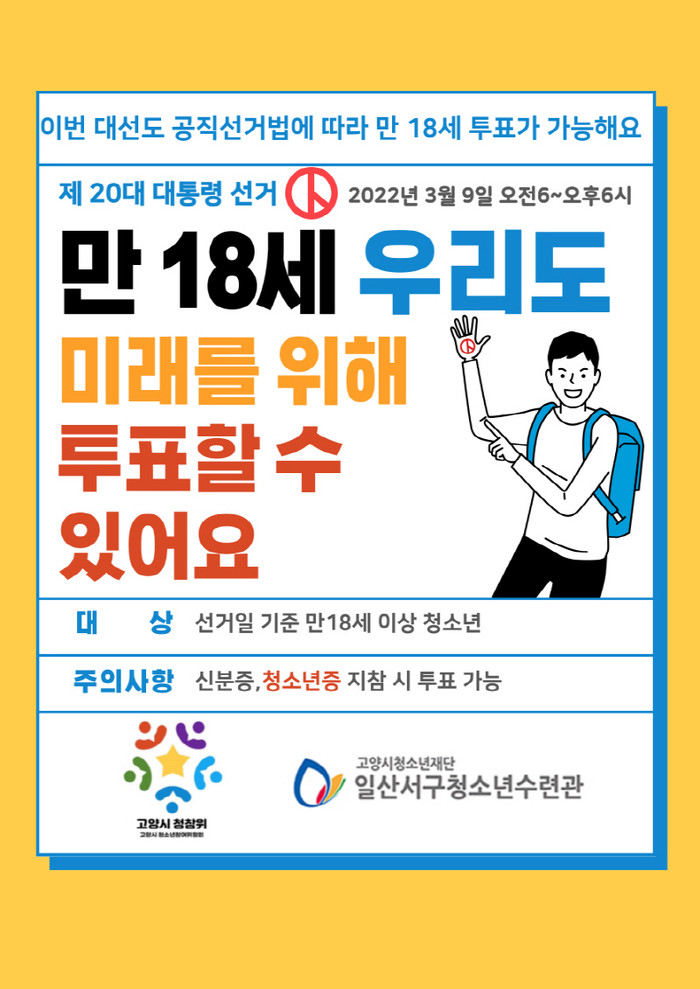 [고양=이기홍 기자] 고양시청소년재단 일산서구청소년수련관에서 청소년들의 참여와 권리를 확산하기 위한 청소년 참정권 이벤트를 현재부터 오는 9일 18시까지 진행된다.